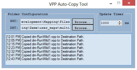 Application that copies all modified VPP files in the Source Directory (Recursively) to the Destination Directory. Allows Map designers to more readily organize their files while creating maps. Common usage would be to copy modified VPPs to user_maps/multi after packing in RED.