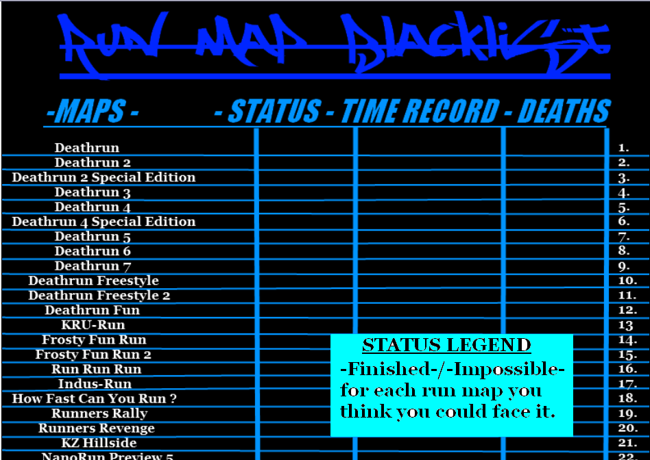 This isn't a map, it is a blacklist picture so you can post up your achievements/records for each run map you've completed or you failed to do it at all.