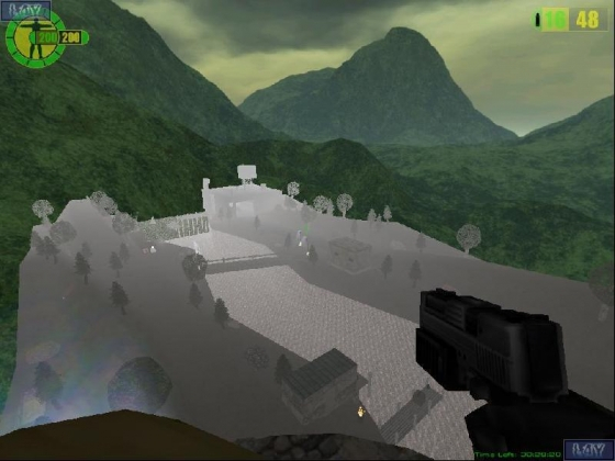 DESCRIPTION: This is a small supply station on both banks of a river. There are five main buildings: Lighthouse, Warehouse, Residence, storage shed and Mess Hall. The river itself is deep and contains secrets and goodies including swimming fish. The atmosphere is foggy and stormy. All trees are climbable. There are many tunnels that criss-cross the terrain. The cannons are jump-pads and there are 2 jump-pads on the roof of the warehouse. There are three vehicles that you can drive: A futuristic jet fighter, a self-propelled rocket launcher, and a leaky barge (air, land, and water). Be careful when running around because the general has scattered landmines around his base (hit one and instantly die).