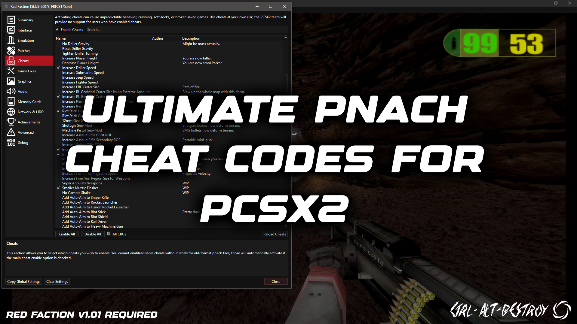 This is a PNACH file for the 1.01 version of Red Faction (SLUS-20073) that I've been working on for quite a while now alongside with a somewhat reverse engineering project and retexturing project.