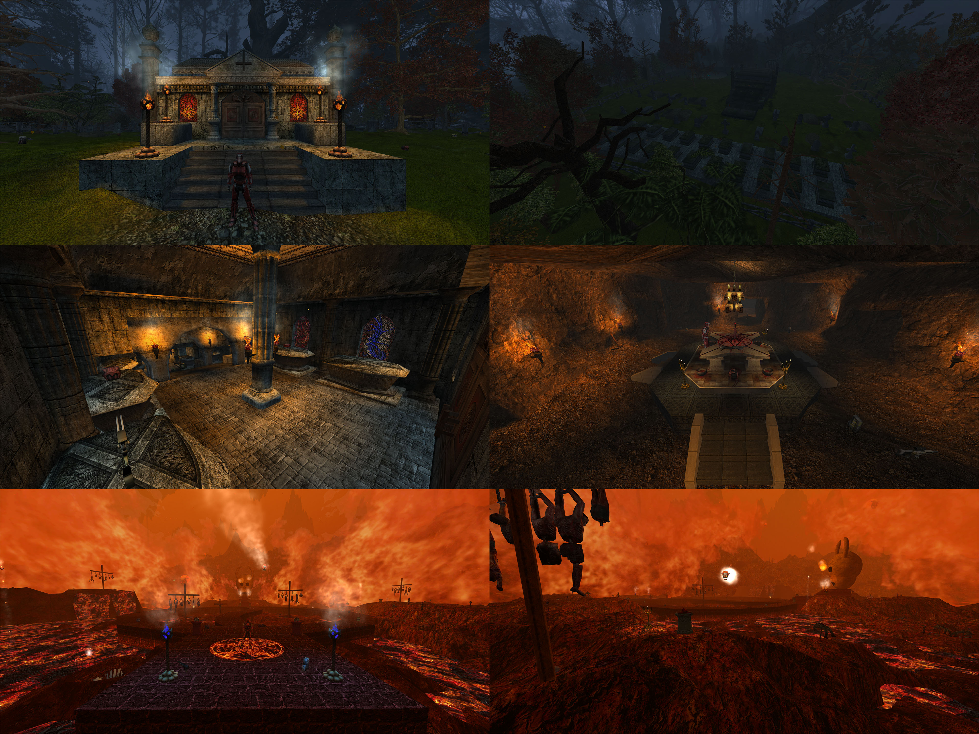 The map has 3 unique areas connected via teleporters. Each area has its own skybox, fog settings, music and ambience. There is the above ground area with a mausoleum, cemetery and surrounded by forest. There are the catacombs underground and there is Hell in another dimension.